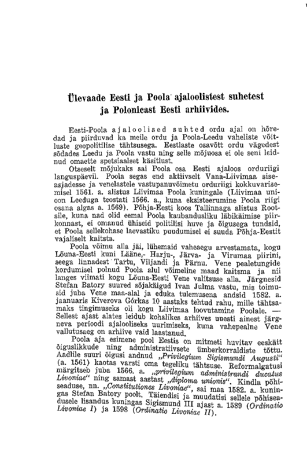 Ülevaade Eesti ja Poola ajaloolistest suhetest ja Polonicast Eesti arhiivides