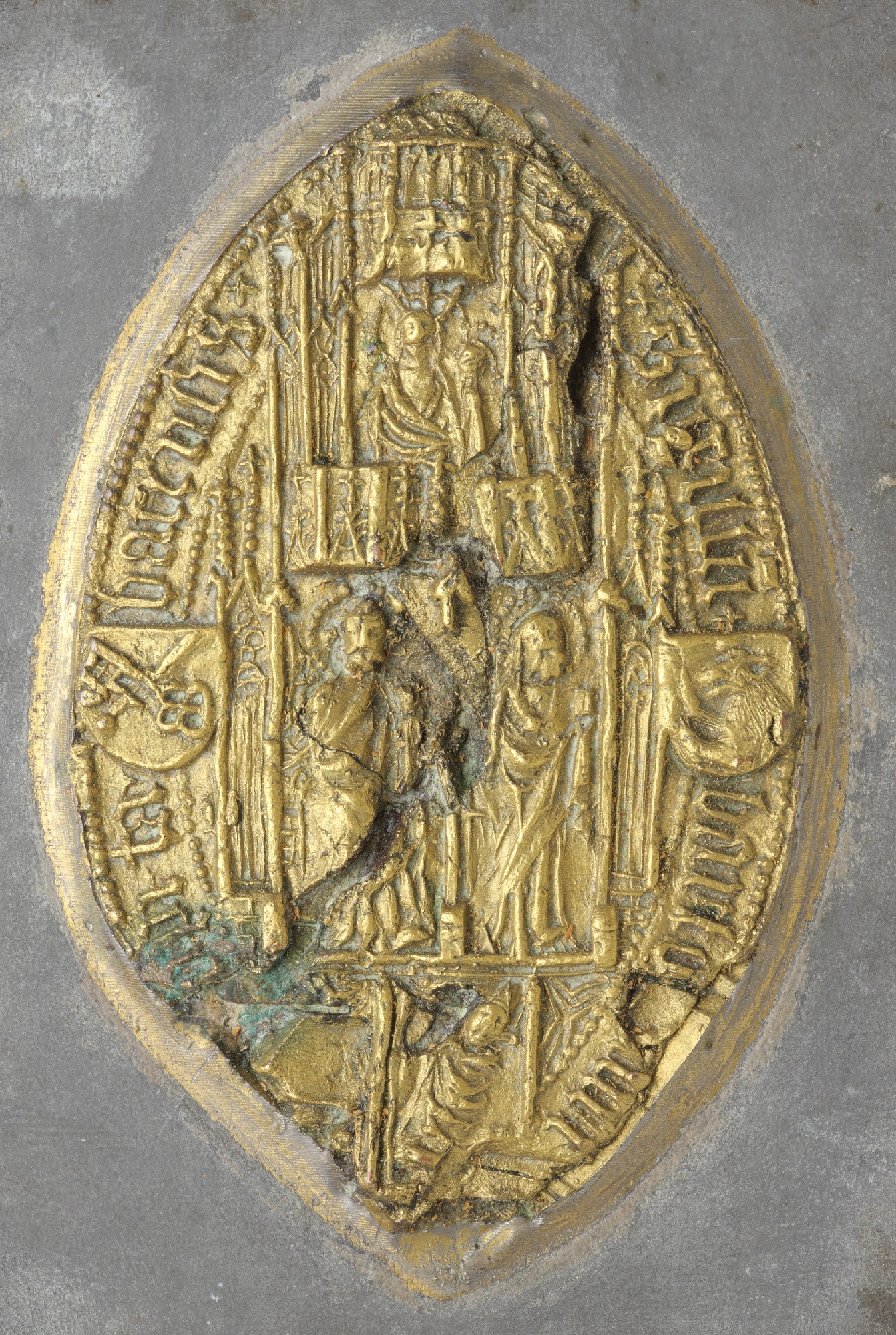 | Esikülje kirjeldus | Pitseri väljal tabernaakli all apostlid Peetrus ja Paulus, ülal Neitsi Maarja Jeesuslapsega vasakul käel; jalutsis põlvili palvetav piiskop; apostlite kõrval paremal vapikilp piiskopkonna vapiga- Andrease ristina mõõk ja võti ning vasakul perekonna vapp - karu ette sirutatud käppadega. |