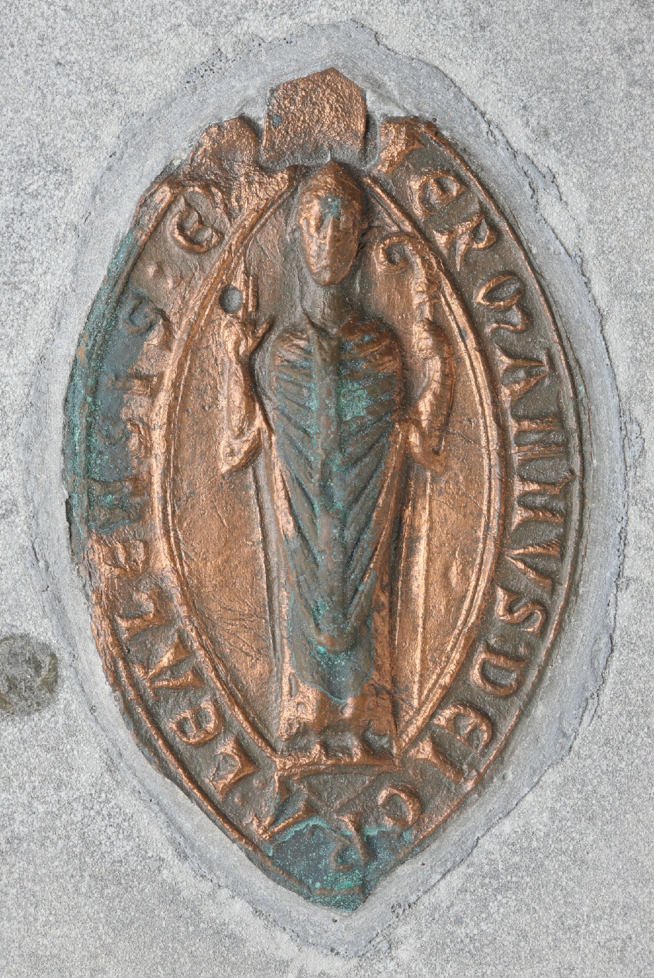| Esikülje kirjeldus | Pitseri väljal seisev piiskop, parem käsi tõstetud õnnistamiseks ja vasakus käes sau. |