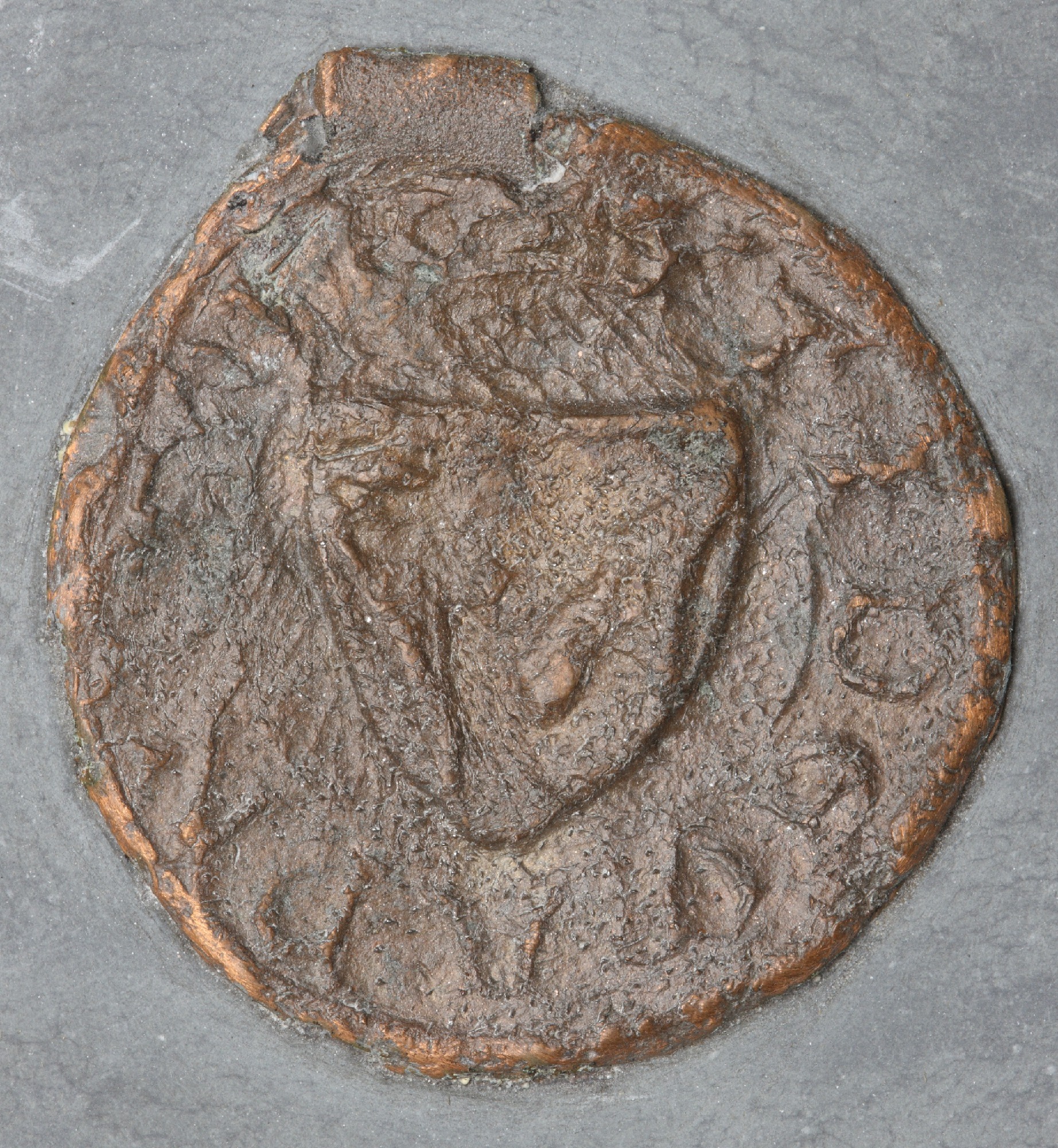 | Esikülje kirjeldus | Pitseri väljal vapikilbil raudrüüs käsi hoidmas ussi. |