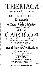 | Titel | THERIACA Andromachi Senioris Una Cum MITRIDATIO Damocratis In hac A Sacra Regia Majestate Serenißimo ac Potentißimo REGE CAROLO XI. Ad supplices Possessorum preces valid confirmata gratiosissimisq[ue] Privilegiis donata atq[ue] munita Officina Dorpatensi Pharmaceutica … Maxima fide ... GOTHOFREDO Hasenfelder, Regiae Academiae & Civitatis Dorpatensis Pharmacopoeo Privilegiato. |