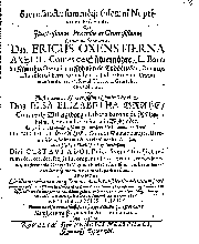 | Titel | Sacrosanctae summeque solemni Nuptiarum Festivitati, Qua Illustrissimus, Praecelsus ac Generosissimus Comes ac Dominus, Dn. ERICUS OXENSTIERNA AXELII, Comes de Südremöhre, L. Baro in Kimitho, Dynasta in Fyholm & Tydöön,&c. Ducatus Esthonici Gubernator inclytus, Judicij Provinc. Praeses eminentiss. Arcisq[ue] Reval, Toparcha Generalis, SPONSUS: Cum Illustrissima ac Generosissima Comite Virgine Dna. ELSA ELIZABETHA BRAHE, (..) EPITHALAMIIS HISCE Humilimae observantiae fautissimaeque apprecationis g. adgratulatur Ministerium Revaliense Acropolitanum |