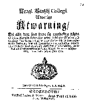 | Pealkiri | Kongl. Cantzlij Collegii Alwarlige Åtwarning, Til alla dem som weta sig innehafwa några Original Cantzlij Acter eller andre Publique Skrifter och Cronones Handlingar, dem de anten sielfwe wid de dem anförtrodde Ämbeten, wärf och Commissioner til nödtorften nyttiat, eller och uppå hwariehanda sätt eliest fått uti sina händer, at de dem alle oförsummeligen til Kongl. May:tz Archivum inlefwerera |