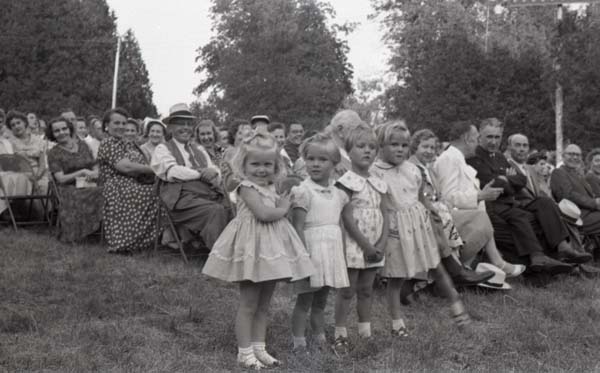 | Sisuline kirjeldus | Laupäeval 30. juunil ja pühapäeval 1. juulil 1956. a. toimus algusega kell 18:00 Kitcehneri lähedal Pilkengtonis Seedrioru suvekodu maa-alal, 65 miili Torontost Eesti Laulupäev Kanadas. Laupäeval oli kohal 3000 osavõtjat. Osa võtsid eesti segakoorid Buffalost, Torontost, Montrealist, Hamiltonist, Kitchenerist, Londonist ja St. Catharines’ist. Laulupäeva üldjuht oli Roman Toi. Laulupäeva peokõne pidas Ludvig Juht Bostonist. Õhtune Valguspidu hakkas kell 22:00, mille korraldasid Eesti Spordiselts Kalev võimlejad, kes ise koos rahvatantsijatega Torontost esinesid. Laulupäev oli Kanada eestlaskonna silmapaistvaks 1956. aasta rahvuskultuuriliseks sündmuseks, aga ka heaks toetuseks Eesti laste suvekodule, mille heaks läks Laulupäeva tulu. Pühapäeval, 1. juulil kell 11:00 toimus kontsert-jumalateenistus, kus esines kontrabassil Ludvig Juht, keda klaveril saatis Roman Toi. Töötas einelaud soojade eestipäraste toitude ja karastavate jookidega. Pääsmed maksid $1.50 ja autoarkimine oli tasuta. Neli väikest tüdrukut seisavad Eesti Laulupäeva pealtvaatajate ees. Nende kõrval istuvad paremal Ludvig Juhti abikaasa Amanda Juht (1900-1988), kontrabassimängija ja -õppejõud Ludvig Juht (1894-1957), ?, ?, ?. Seeria teised kaadrid: FK_1-103-112, FK_1-1185-1199, FK_1-6950 ja FK_1-6953 |