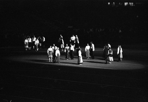 | Sisuline kirjeldus | Eestlaste suurüritus Lend läände 72: Eesti Skautlike Noorte Maleva Rootsis esindusüksus ülemaailmsetel Eesti Päevadel Torontos. Valguspidu Grandstandll Näituseväljakul. Vaade staadionil tantsivatele rahvariietes tantsijatele. |