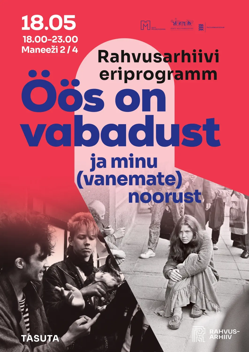 Muuseumiööl 18. mail avame õhtustele külalistele Maneeži maja uksed, kus pakume 1980. aastate noortekultuuri eriprogrammi “Öös on vabadust ja minu (vanemate) noorust”. Maneeži 4 asub Eesti üks viimaseid nõukogudeaegseid arhiivihooneid, mida on võimalik uudistada veel ainult piiratud kordadel enne Rahvusarhiivi kolimist Tõnismäele Rahvusraamatukogu renoveeritud majja. Muuseumiööl ootame külastajaid 18.00-23.00.