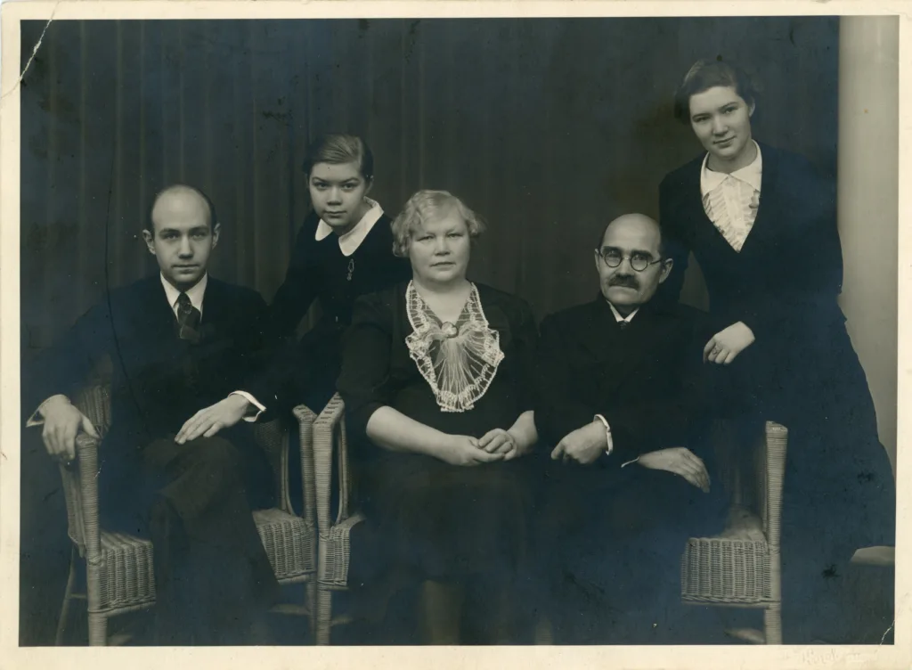 Foto: ERA.4991.1.186.50. Perekond Eliaser: Rein (jun), Elga, Anna, Rein (sen) ja Agnia. 1938